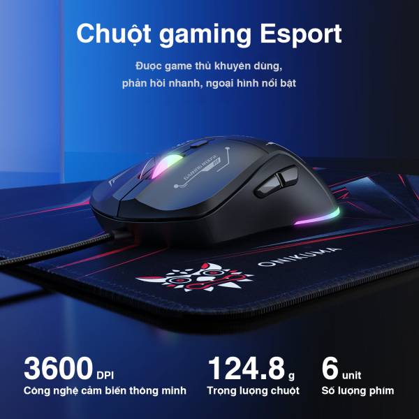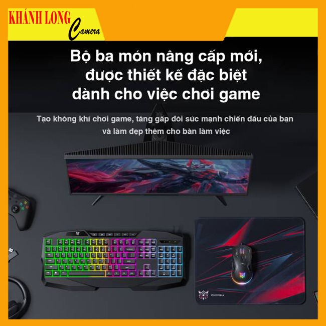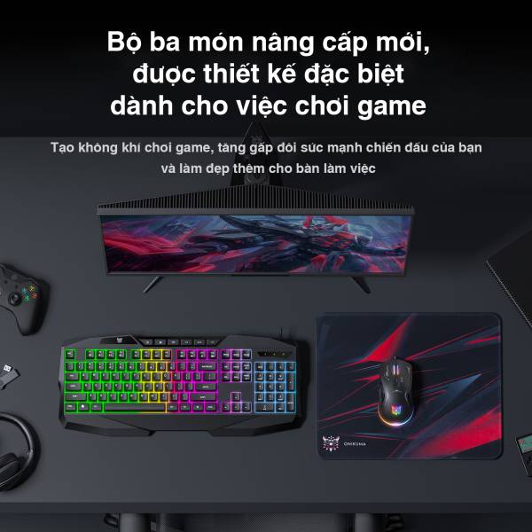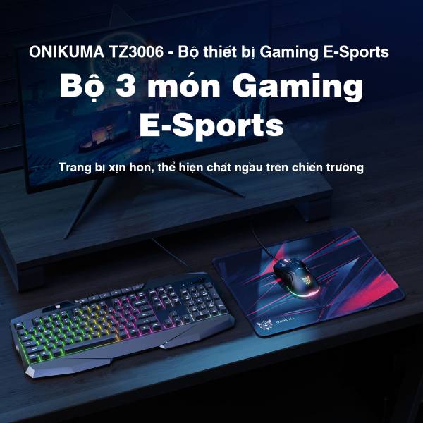 Combo Onikuma TZ3006 3 in 1 gồm: Bàn phím G22 104 phím (membrane), chuột chơi game CW917 (3600 DPI có thể chuyển đổi) và lót chuột MP002.