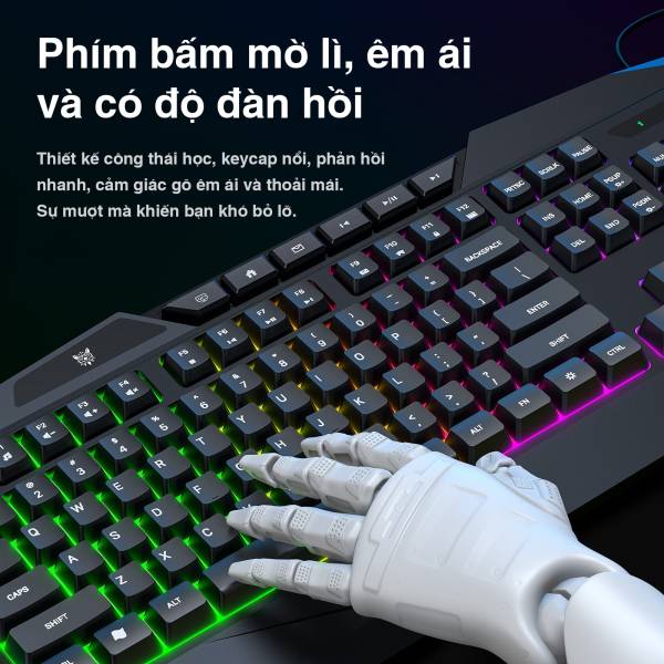 Bàn phím được thiết kế gồm 104 phím bấm mờ lì êm ái và có độ đàn hồi, hệ thống đèn nền RGB 3 màu (3-RGB), tích hợp phím đa phương tiện, thiết kế theo cơ cấu công thái học (nhưng không có kê cổ tay) keycap nổi phản hồi nhanh, cảm giác êm ái, mượt mà và thoải mái.