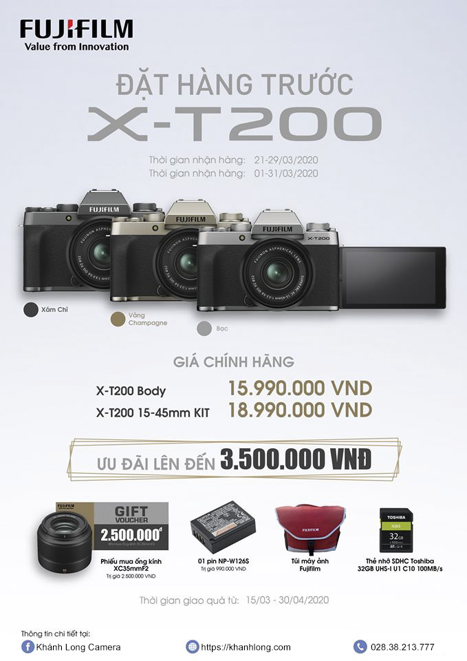 X-T200 hiện đã nhận Đặt trước với giá thân máy khoảng 16 triệu đồng hoặc khoảng 19 triệu đồng đi kèm ống kính zoom 15-45mm F/3.5-5.6 với 3 màu tùy chọn: Silver, Dark Silver và Champagne. Máy dự kiến sẽ được lên kệ hàng Khánh Long vào đầu tháng 3/2020.