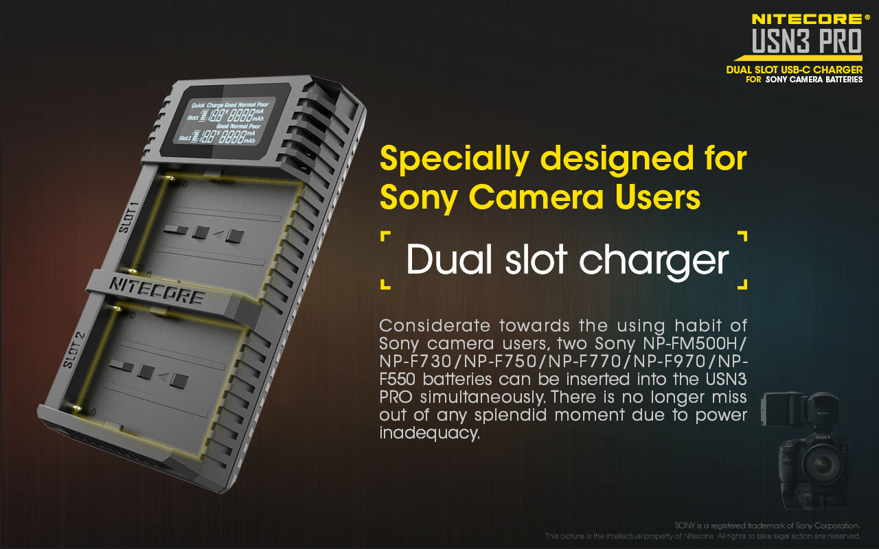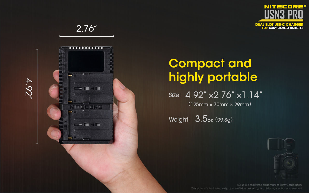 Đế sạc pin Nitecore USN3 PRO - Giải pháp sạc nhanh và hiệu quả cho pin NP-FM500H / NP-F730 / NP-F750 / NP-F770 / NP-F970 / NP-F550 của Sony. Với kết nối USB-Type C tiện lợi, sạc nhanh trong 3 giờ, kích thước nhỏ gọn (125 x 70 x 29 mm), và trọng lượng nhẹ chỉ 99g, đây là phụ kiện lý tưởng để duy trì năng lượng cho máy ảnh của bạn mọi nơi mọi lúc.