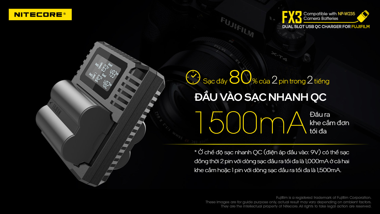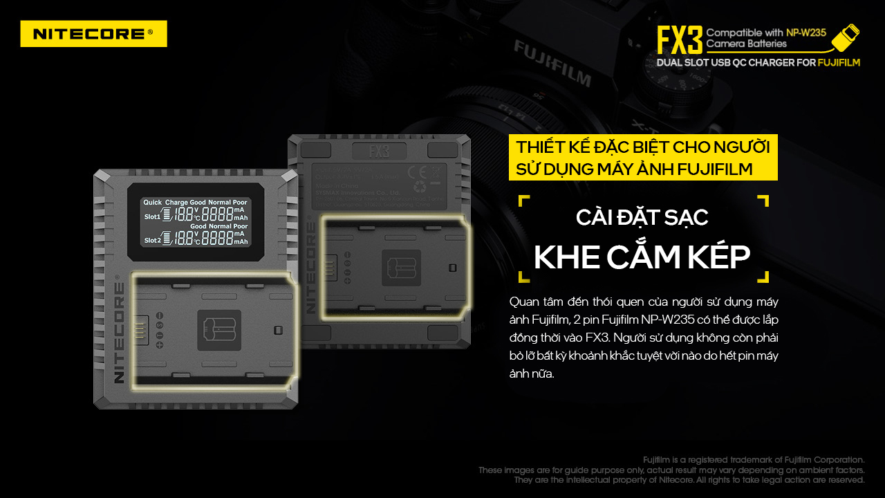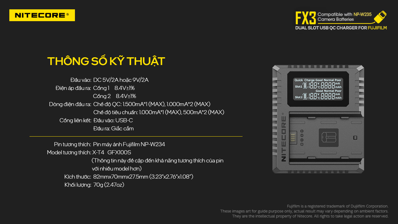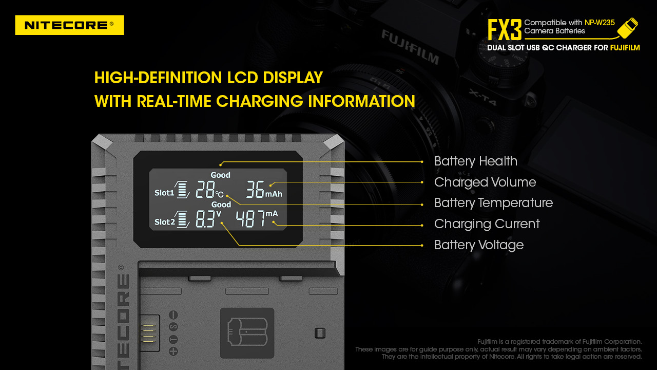 Nitecore FX3 là bộ sạc hỗ trợ sạc nhanh QC có thể sạc đồng thời hai pin NP-W235 với đầu vào USB-Type C và hiển thị thông tin thời gian thực về trạng thái sạc.