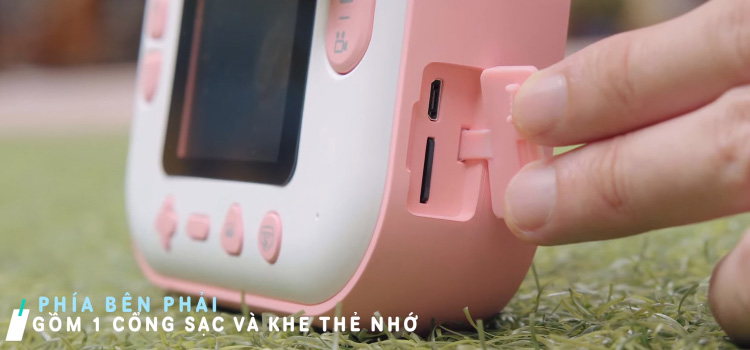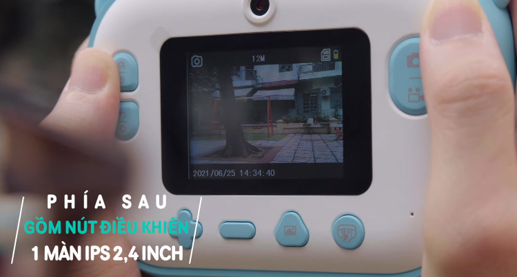Phía trước máy có 1 camera 12MP để chụp ảnh quay phim, bên dưới đó là khe để lấy ảnh. Phía sau máy ảnh trẻ em là các nút điều khiển cùng với 1 màn hình iPS 2,4 inch, ngoài ra ta còn có thêm 1 camera ngay phía trên màn hình để hỗ trợ chụp ảnh selfie